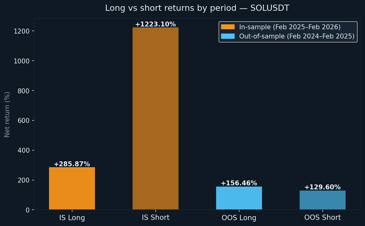 The in-sample period ran from February 2025 to February 2026, during which SOL fell 50.73% on a buy-and-hold basis. The strategy returned +1,508.97% on initial capital over the same period. The short book drove most of that return (+1,223.10%), which makes sense given the sustained downward movement. The long book contributed +285.87%.