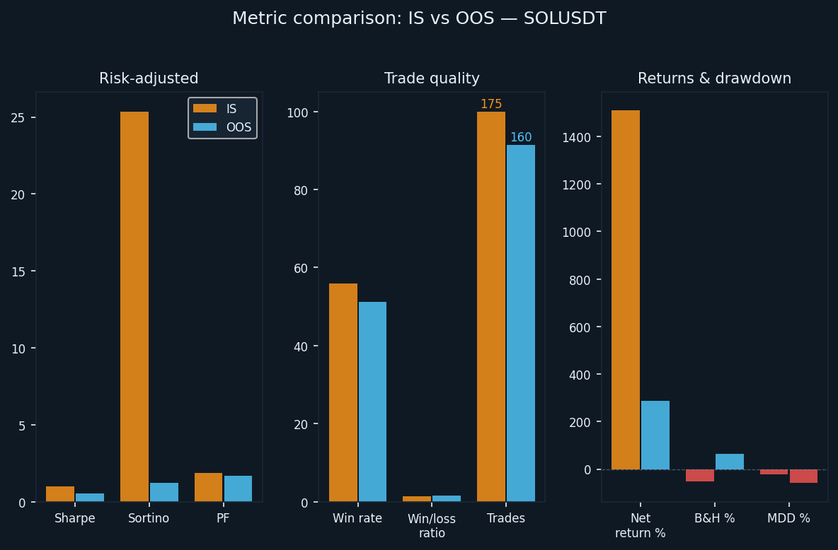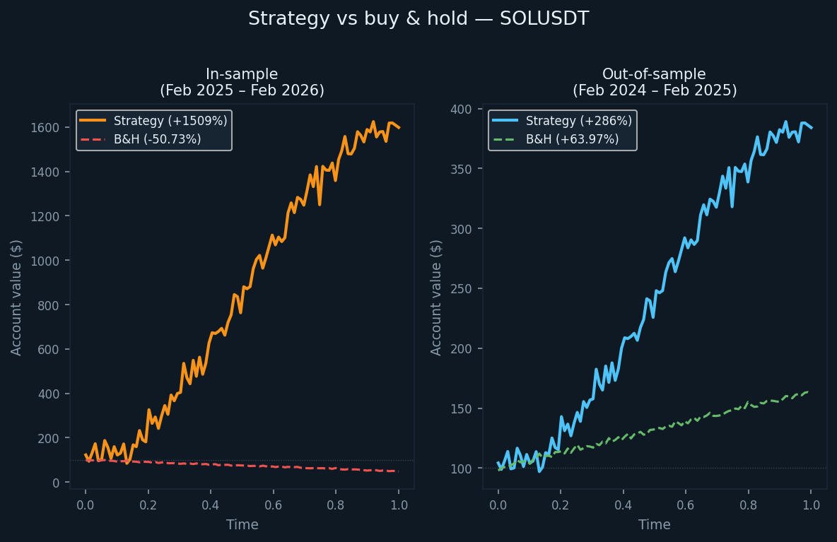 One thing that makes SOLUSDT interesting is that neither period was neutral. The in-sample period was clearly bearish and the out-of-sample period was clearly bullish. The strategy made money on both sides in both environments.