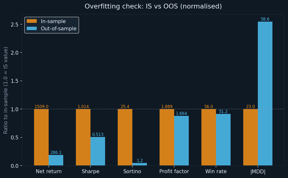 - MDD: from −23.02% (IS) to −58.64% (OOS) — the most significant concern in this dataset